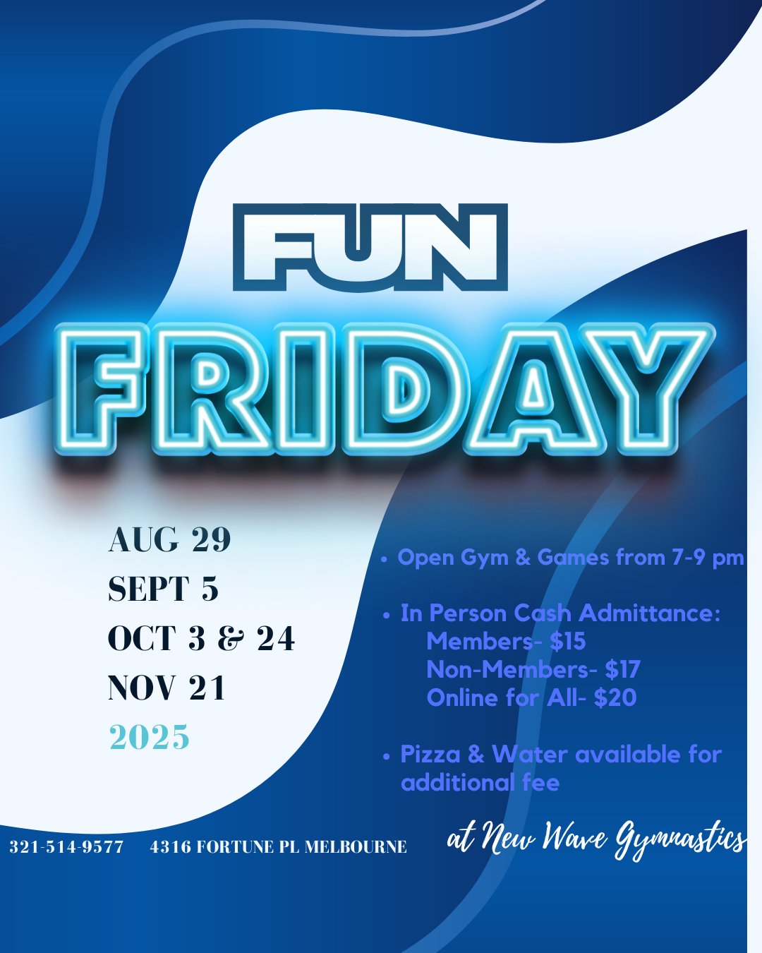 Join us for another FUN FRIDAY at New Wave Gymnastics! Fun Fridays run from 7p.m. to 9p.m. on select Friday nights. Kiddos will enjoy free time, pizza, and game time! Ages 4-14